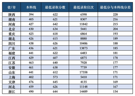 所有招生省市的錄取分數線均超過對應省市本科批次錄取線150分以上,平均分差為186分,達到歷年最高水平;在17個省市的最低錄取分數與學校普通批(物理類)最低錄取分數差額均值為23分,較2024年縮小2分,達到歷年最高水平。