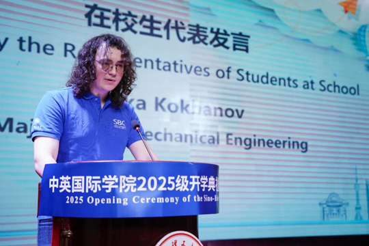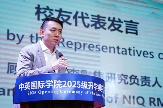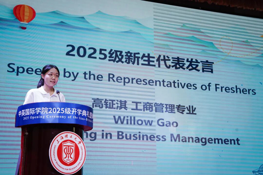 接下來,2025級新生代表高鉦淇分享了初入學院的喜悅與憧憬,希望能與所有新生同學們一起勇于探索、敢于創新,在國際化校園里拼搏出屬于自己的精彩。在校生代表Luka Kokhanov也分享了自己在中英國際學院求學的感受,作為一名國際留學生,期待能與新生同學們組織和參加豐富多彩的跨文化活動,共同感受中國優秀傳統文化的魅力。2008級校友代表、尼爾森零售研究負責人顧問結合自身成長與職場經歷,鼓勵同學們要專注學業的同時,也要勇敢的走出去看世界,感受不同地域的文化風貌,在開闊國際視野的同時,不斷提升和超越自我。