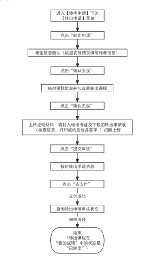 考生提交轉出申請并交費確認后,考生的轉考電子檔案將統一通過國家轉考平臺轉出,轉出目的省市是否接收及審核結果一般可于申請當月月底公布。考生可通過“自考考生服務平臺”—“轉考申請”—“轉出申請”查詢結果。