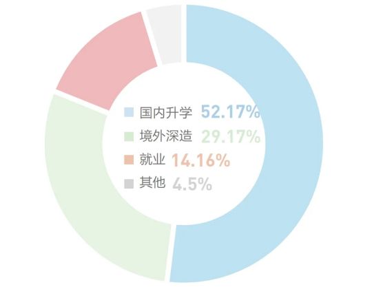 近三年本科畢業生共計600人,其中國內升學313人,占比52.17%;境外深造175人,占比29.17%;就業85人,占比14.16%;其他27人,占比4.5%。